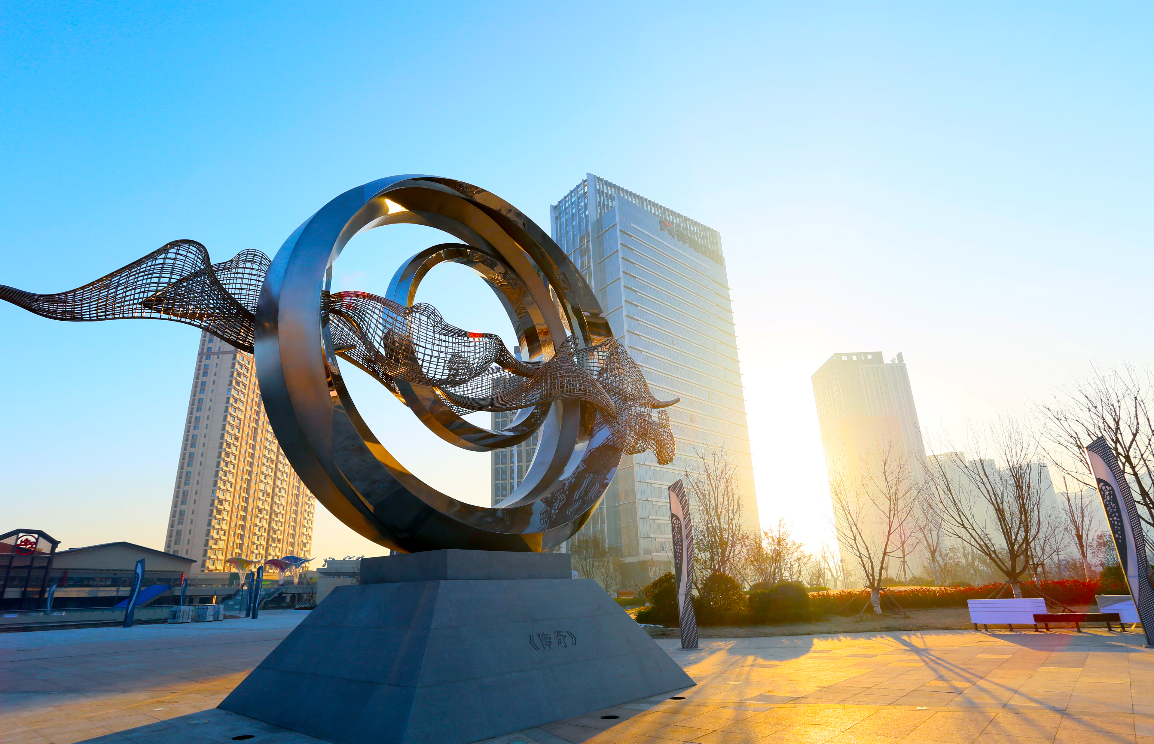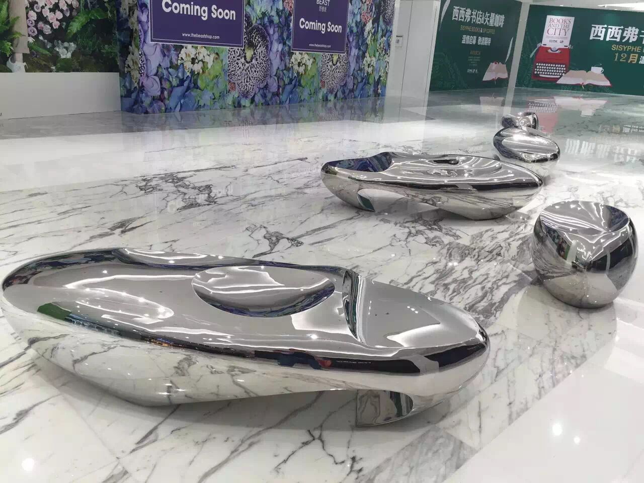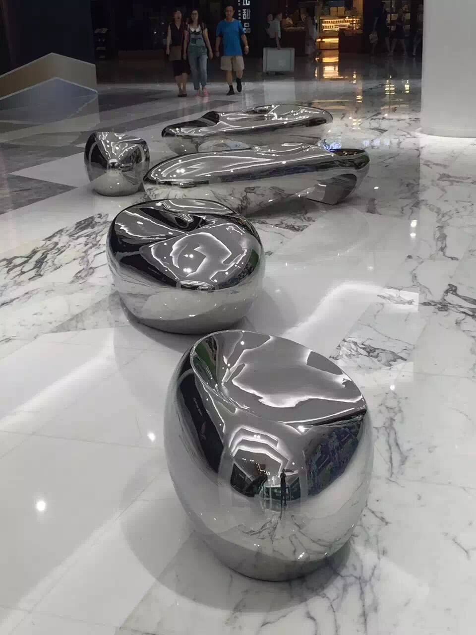 其形态与周边环境共营,不锈钢亮光反射出的环境效果,将人与空间,自然的链接到一起,刺激人们提升对空间的美感认知,形成深刻的记忆点。