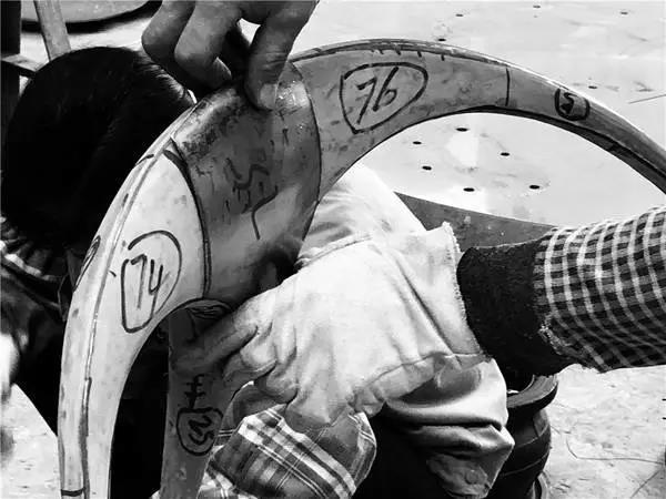Tipart的锻造工艺,第一步先要制模,第二步金属制作工艺将会请具有二十多年经验的老师傅来完成。先要将模具的表面用线划分出无数小块并编上数字;再用放样纸将每块的形状“复制”在不锈钢板上,按照线条分割出来;接着,对每一小块进行反复的敲打和比对;再将所有的小片焊接起来,进行表面接缝的打磨和抛光处理。这里面每一个步骤都必须精准拿捏,才能打造出如镜面般光滑清澈,浑然一体如流水般线条顺畅的异形家具。